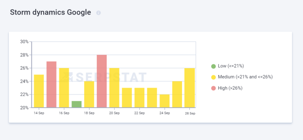 SERP storm is SERPs volatility. One of the tools for analyzing search engine rankings is Serpstat Search Engine Storm. The tool monitors changes on a daily basis and allows you to detect algorithm changes.