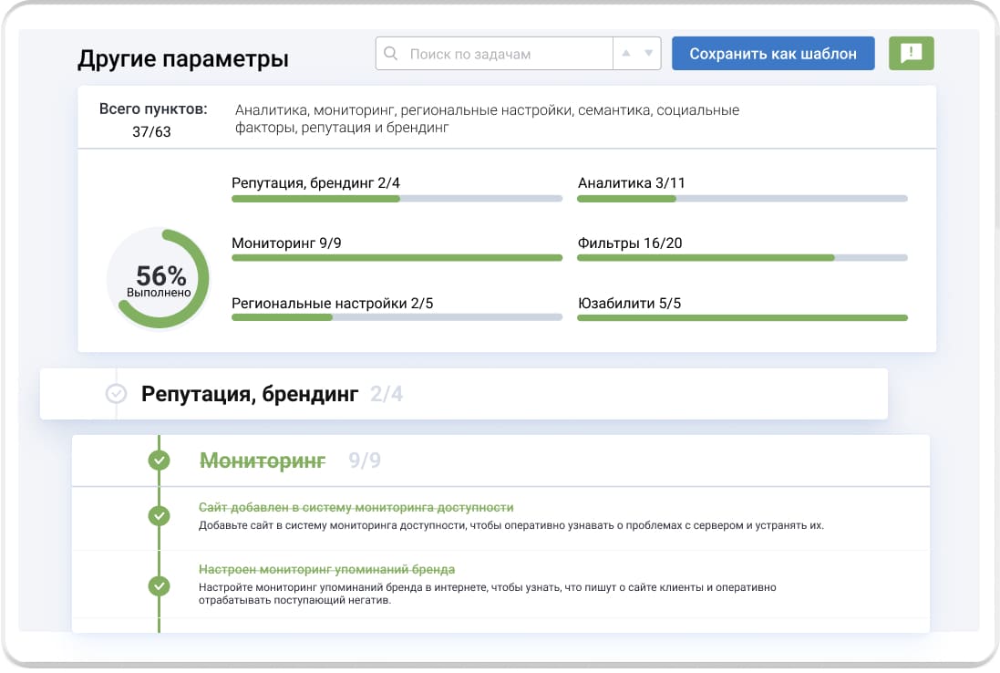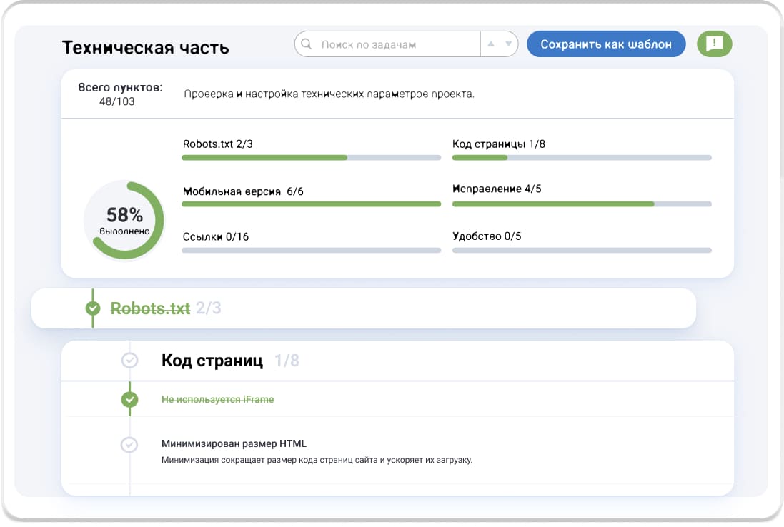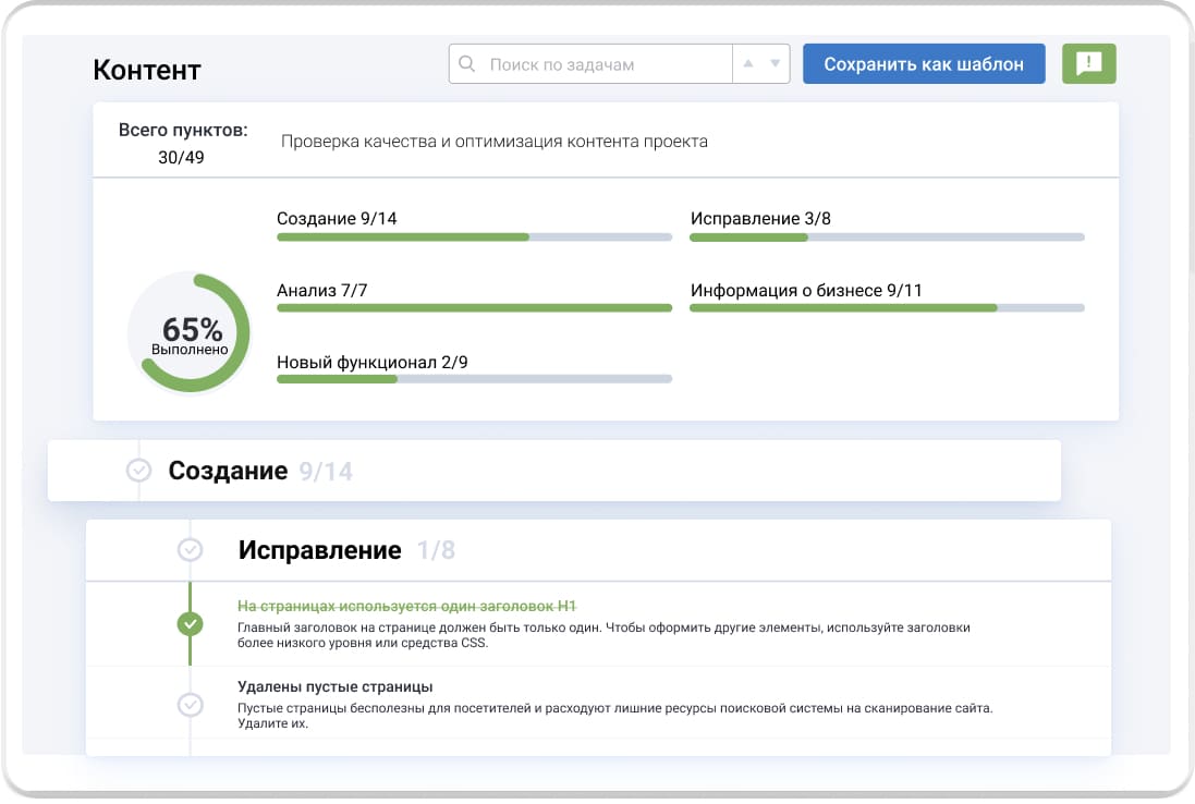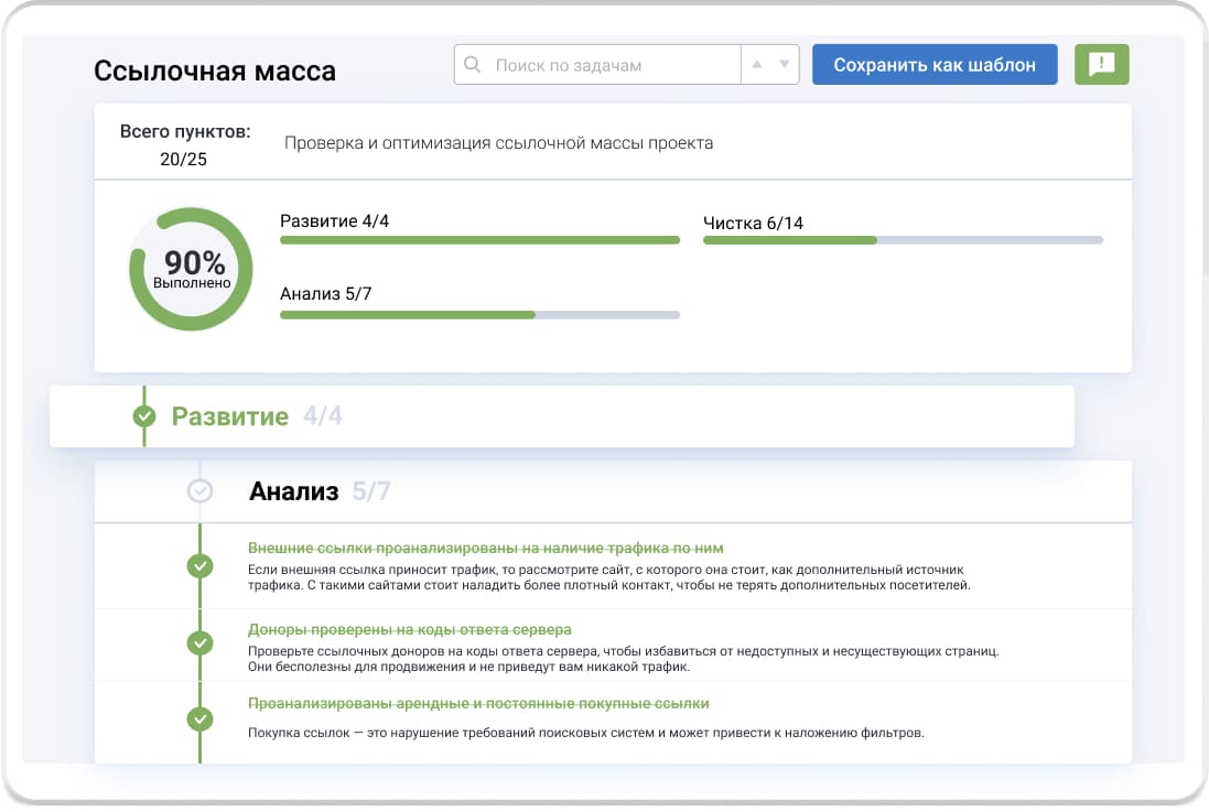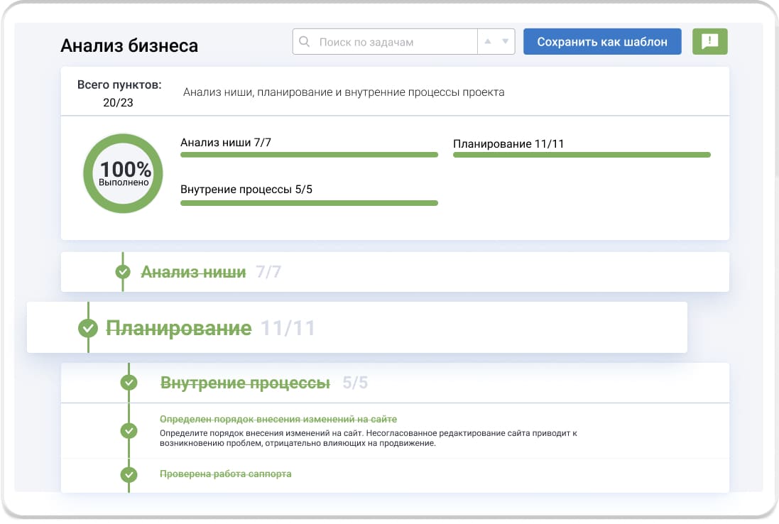 Пошаговые инструкции для SEO и маркетинговых задач разрабатывали практикующие специалисты интернет-маркетинговых компаний. Используйте готовый шаблон или составьте свой и отслеживайте прогресс по проекту