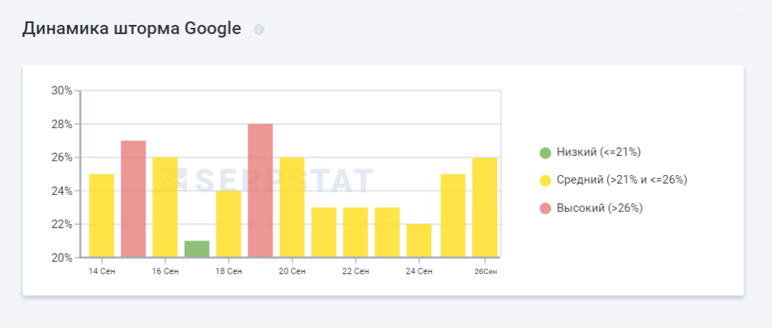Шторм поисковой выдачи — это колебания результатов в поисковой выдаче. Один из инструментов для анализа динамики выдачи — Шторм поисковой выдачи Serpstat. Инструмент мониторит изменения ежедневно и позволяет обнаруживать изменения алгоритмов.