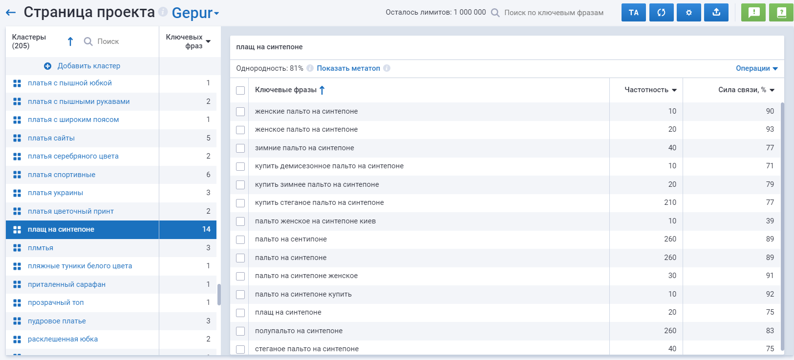 - Автоматически группируйте тысячи ключевых слов в кластеры
