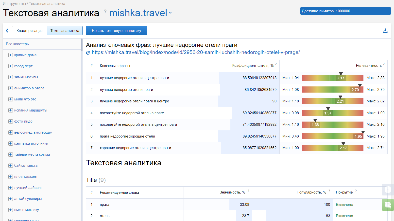 Кластеризация ключевых слов помогает распределить тысячи ключевых фраз по страницам автоматически. Создайте структуру оптимальную будущего или существующего сайта, сгруппировав большое количество ключевых слов в семантически связанные кластеры.