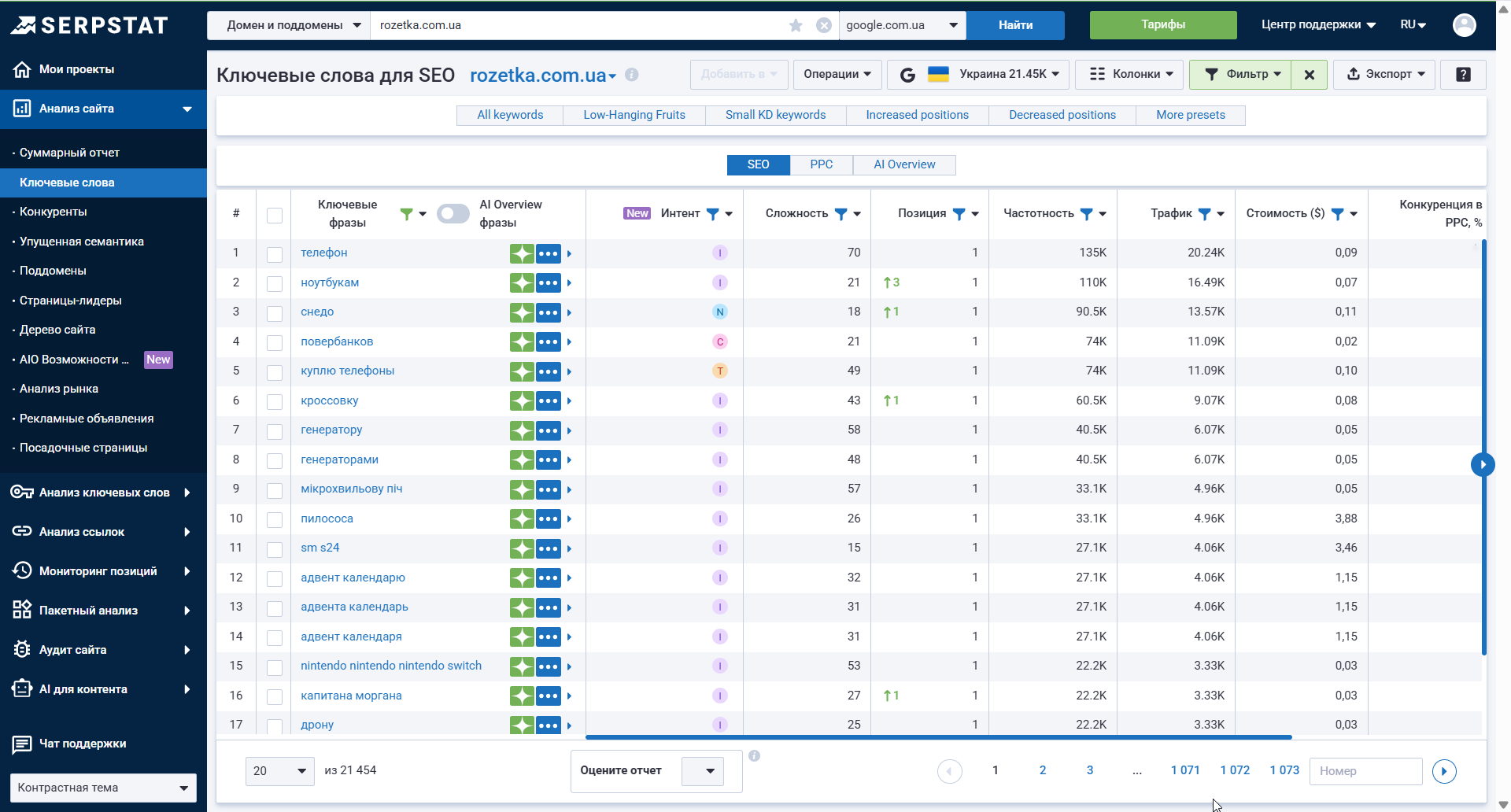 Фильтр «Трафик» выведет список фраз домена с определенным трафиком.