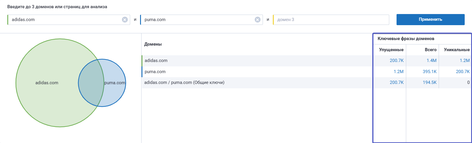 Отчёт позволяет сравнить семантику двух или трёх доменов (или страниц) одновременно, формируя выгрузку с потерянными, уникальными и общими фразами. Таким образом вы быстро получите ключевые фразы, по которым домены или страницы конкурентов ранжируются в поиске, а анализируемый — нет.