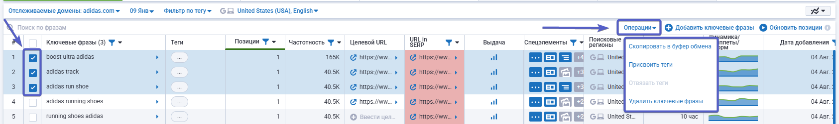 Теги — для каждой ключевой фразы можно назначить теги (один или несколько) для удобства работы с ключами.