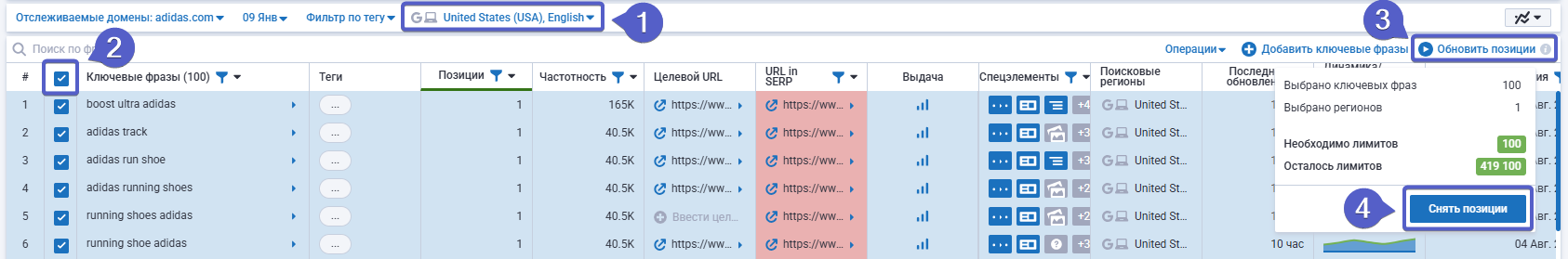 Последнее обновление — время или день, когда было последнее обновление позиций по фразам.