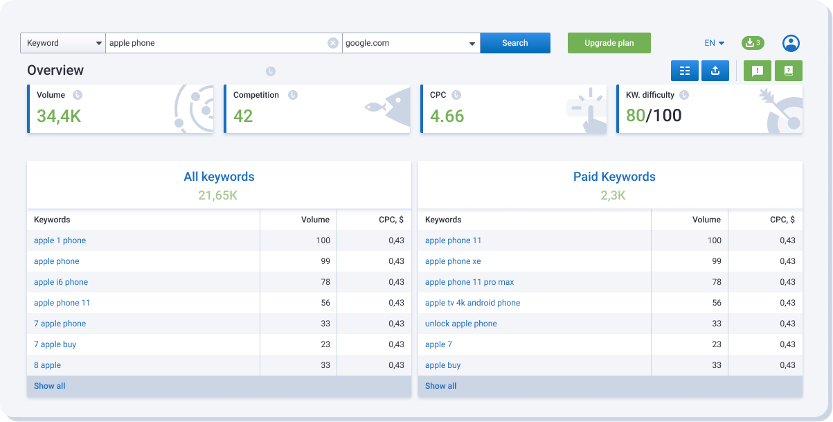 Check the keywords' search volume and detect the most popular and trending points for your business. Evaluate demand by keywords, predict successful deals, and define the competition level in a new niche. Learn more