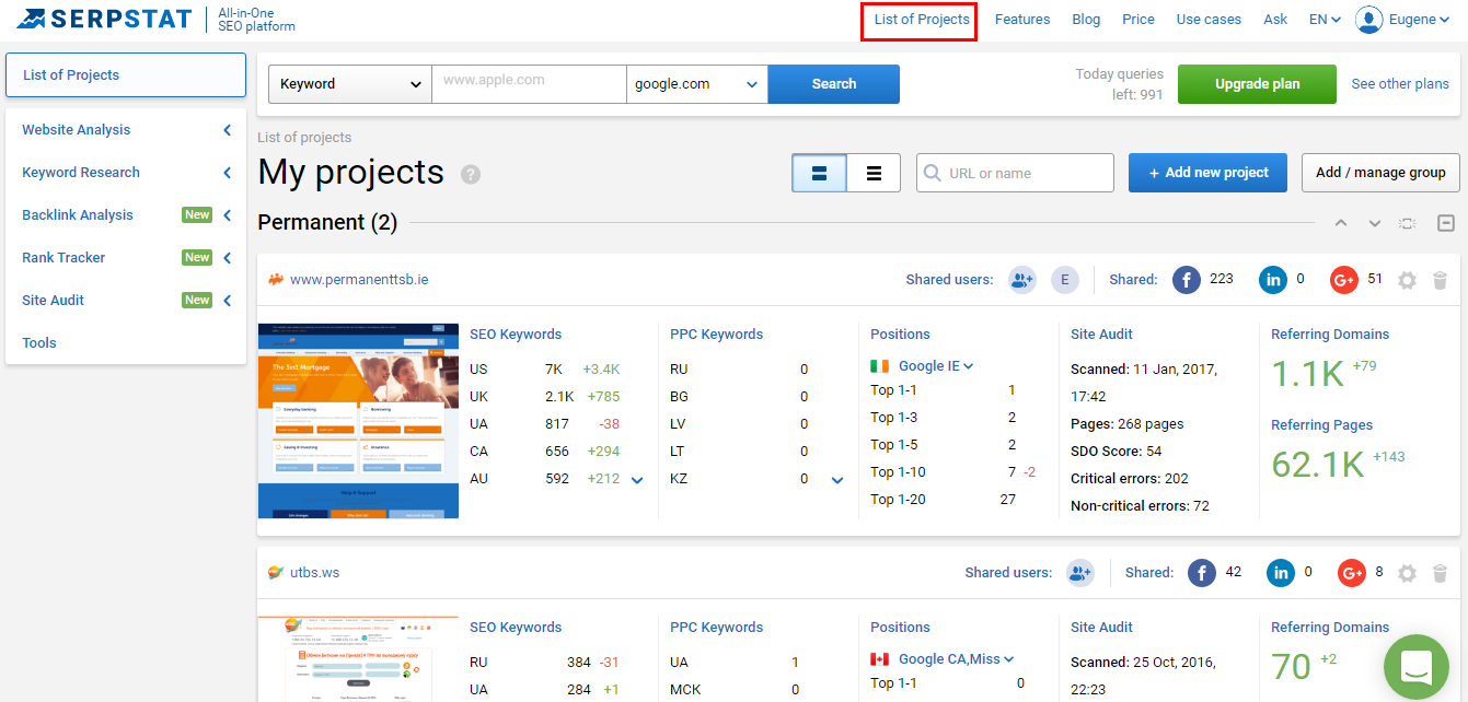 List of Projects is a dashboard on Serpstat where you can access and manipulate your existing projects or create new projects and project groups for Rank Tracking, SEO Audit and aggregate domain metrics. From the List of Projects, you can navigate to detailed reports on the domain's organic and paid keywords, backlinks, positions or errors.