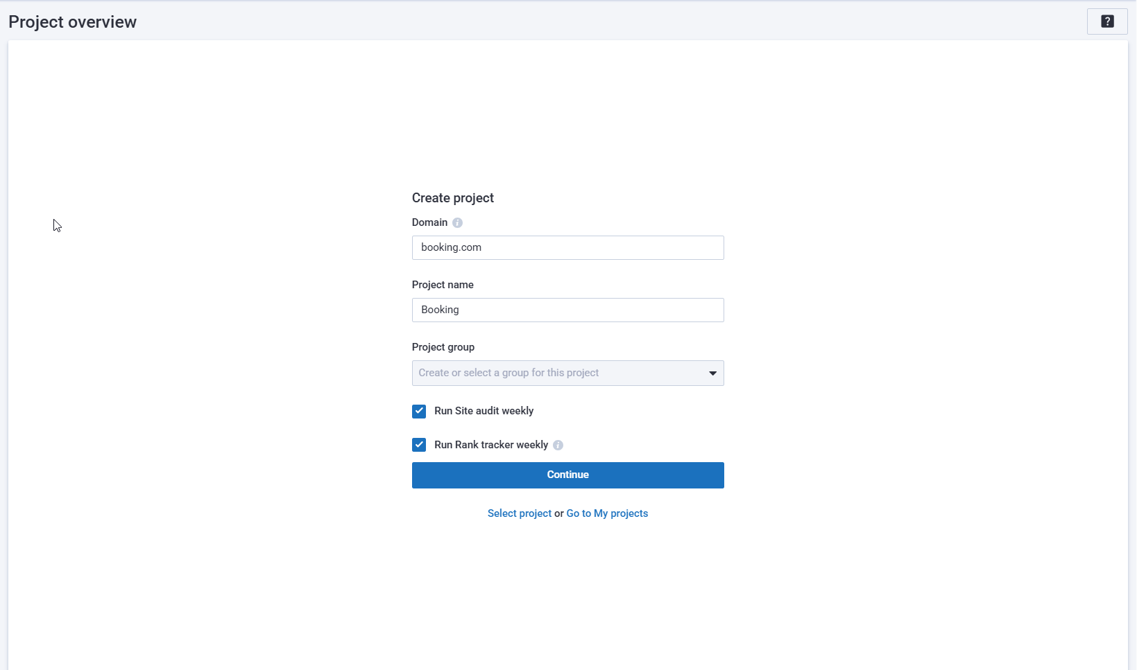 If you are creating a new project, add your website’s domain and enter the project name. You can also select a group for this project if needed. Additionally, you can enable weekly site audit and weekly rank tracking — in this case, Serpstat will automatically collect your website’s keywords and set up the tracking for you.