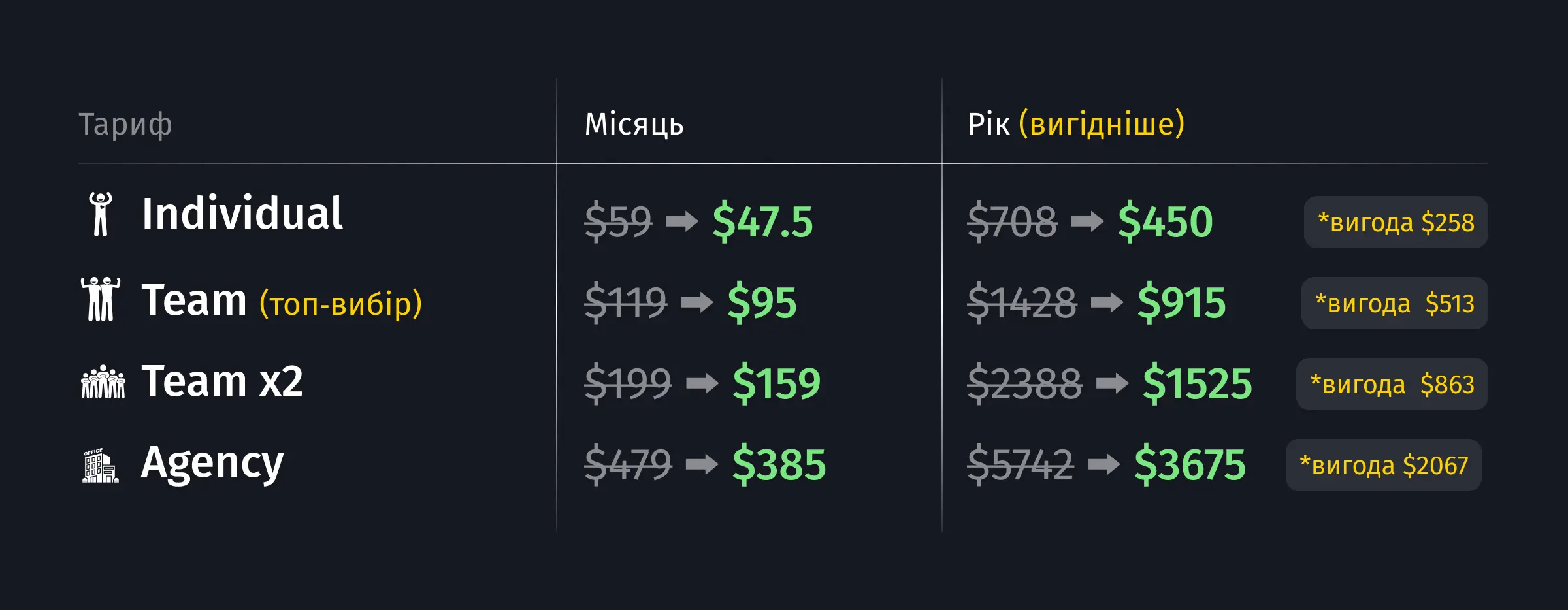 | зі знижкою 20% → $31 (200 лімітів) | $0.20 за ліміт |