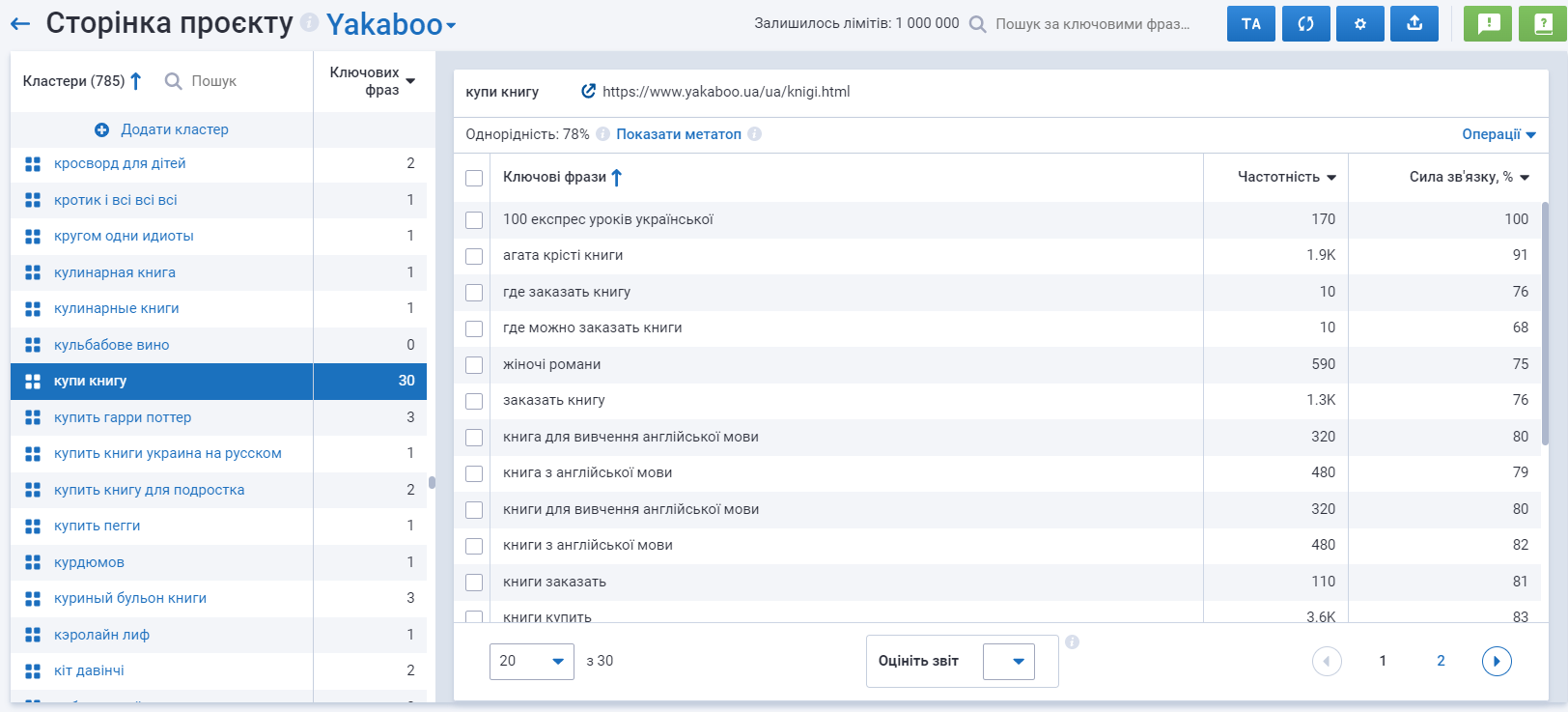 - Автоматично групуйте тисячі ключових слів у кластери