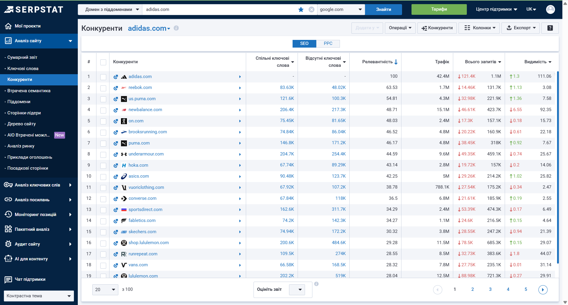 Цей звіт — відправний пункт для детального пропрацювання семантичного ядра суперників за певною сторінкою і впровадження на сайт. Тут перелічено конкурентів сайту або сторінки сайту за подібними ключовими словами.