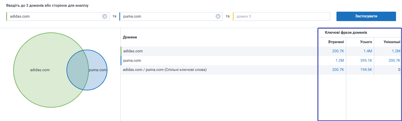 Якщо ви порівнюєте тільки два домени, то у стовпці «Втрачені» для першого домену відображатимуться унікальні фрази другого, і навпаки — для другого домену показуватимуться унікальні фрази першого.