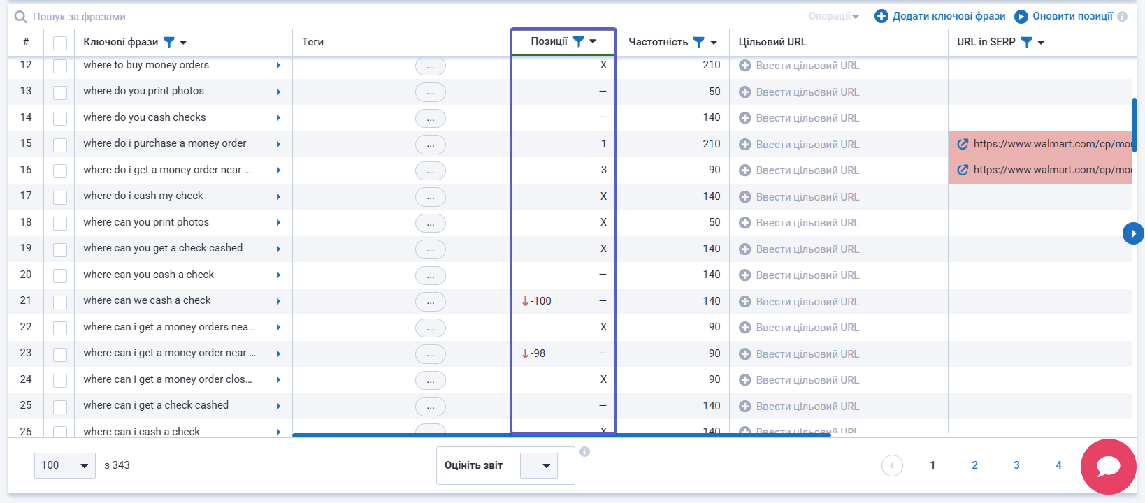 У таблиці з ключовими словами, яку ви можете налаштувати, є звіт з позиціями, що ілюструє місце, яке посідає сайт у видачі за відстежуваними фразами, частотність і динаміку.